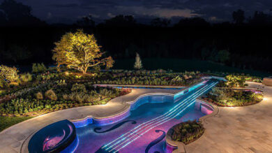 استخدام الإضاءة الملونة في اضاءة حمامات السباحة هي واحدة من الطرق التقليدية، ولكن المصممين فى شركة ماى بولز قاموا بتطوير الإضاءة بدمج ألوانها وتناسقها مع بعضها البعض لتعطى إحساسا بالهدوء والراحة وجمال المنظر .