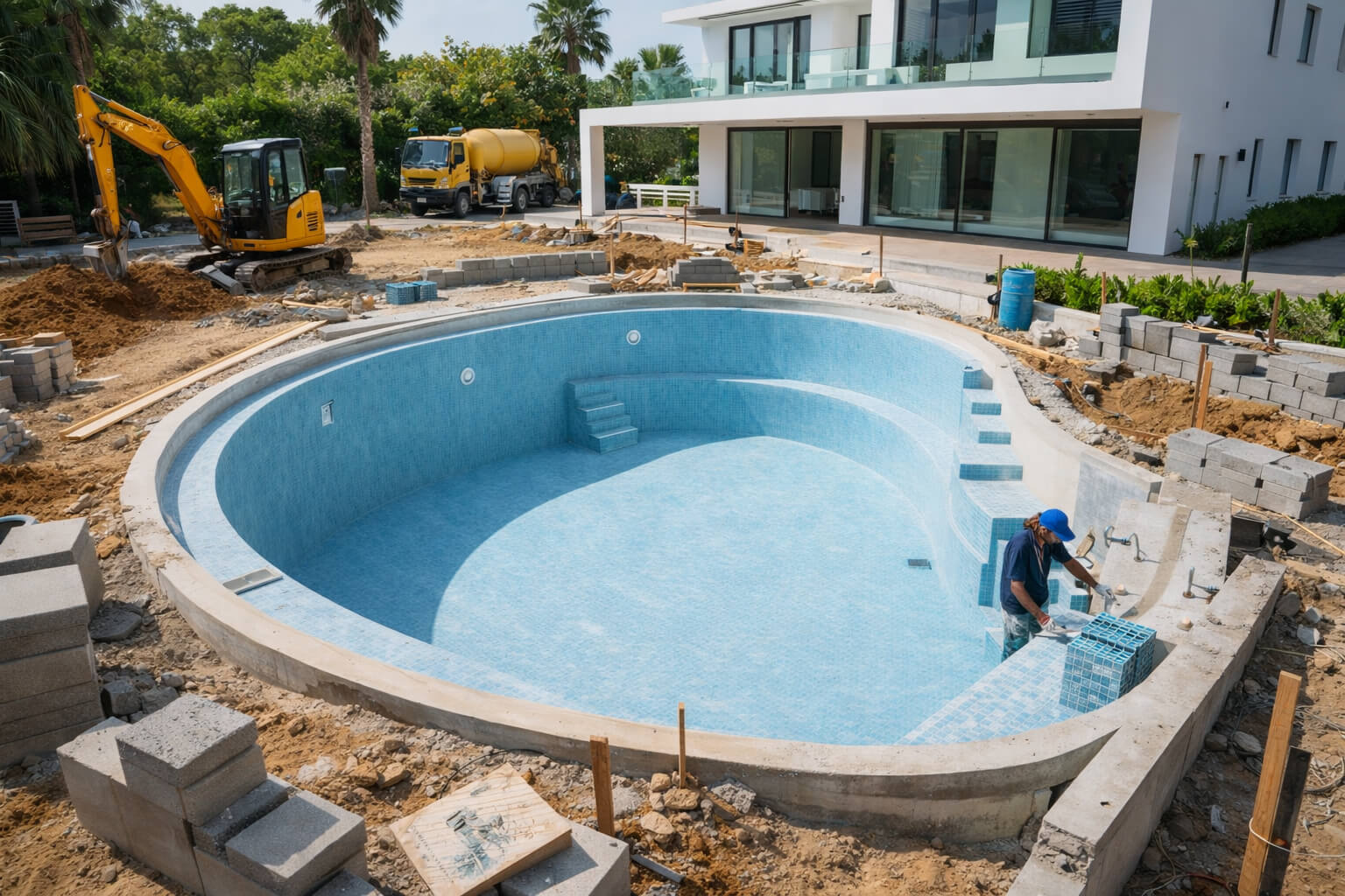 النتيجة: حمام سباحة متكامل يجمع بين القوة الإنشائية، الأداء العالي، والمظهر الجمالي الفاخر.