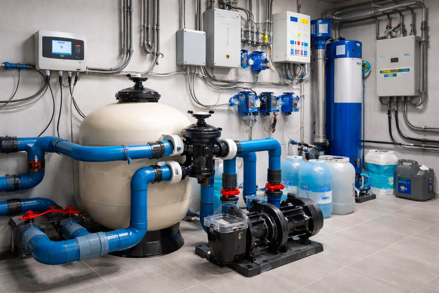 مضخات، فلاتر، مواسير، لوحات تحكم، أنظمة تعقيم وتشغيل